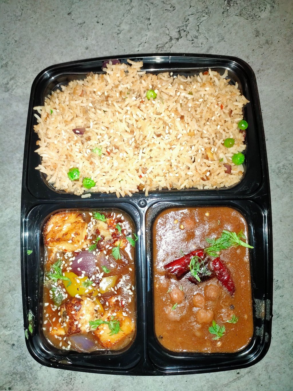 6 poori, Veg Fried Rice, Chilly paneer, Chana Masala, Sewai Kheer & spicy onions